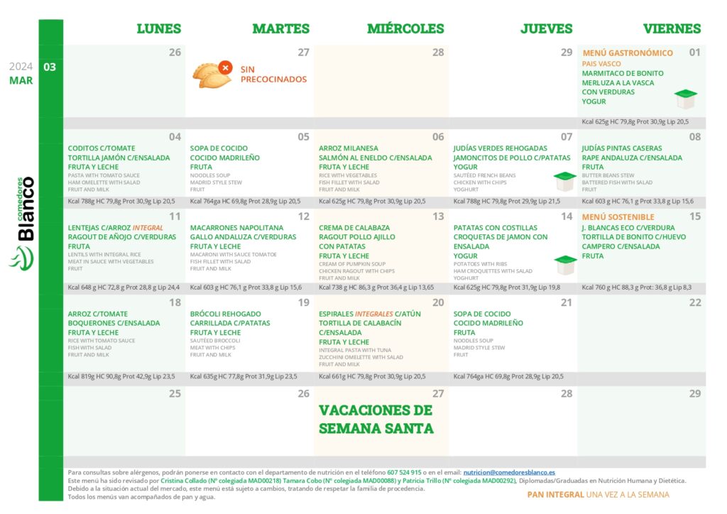 Cada mes, incorporamos a nuestros menús un día dedicado a resaltar la gastronomía de distintas regiones de España. Por ejemplo, hemos presentado el delicioso Cocido Madrileño en el menú gastronómico de la Comunidad de Madrid, y también hemos ofrecido especialidades como el Marmitako de Bonito y el Pollo a la Vasca con Verduras en el menú dedicado al País Vasco.